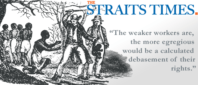 MIGRANT workers performing hard labour in mainly the construction and marine industries do not lack advocates. Lobby groups like Transient Workers Count Too (TWC2) and feeding programmes for under-employed work permit holders have been doing heartening work in fighting to improve their welfare. At the apex, the Manpower Ministry’s enforcement division sees to it that derelictions of employer responsibilities brought to its attention are put right swiftly. But civil society advocacy and reactive actions by a bureaucracy have limitations in an area of labour relations where the balance of bargaining power is totally on the side of employers and recruitment agents. Their hired help land in Singapore heavily in debt to agents before they have done a stroke of work.
