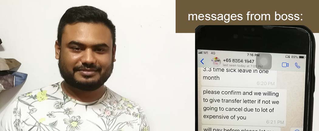However, within about a week of starting work, he came down with dengue fever. There followed a dispute with his boss about medical leave wages and meals not being provided to him during his recovery. Sumon showed TWC2 the WhatsApp messages he exchanged with his boss, and on perusal, our sense is that the employer was unhappy that he fell ill so soon after hiring him. This can be seen from messages from the boss saying “3 time[s] sick leave in one month” which probably referred to the extensions of his medical leave for a proper recovery, and “due to a lot of expensive of you”.