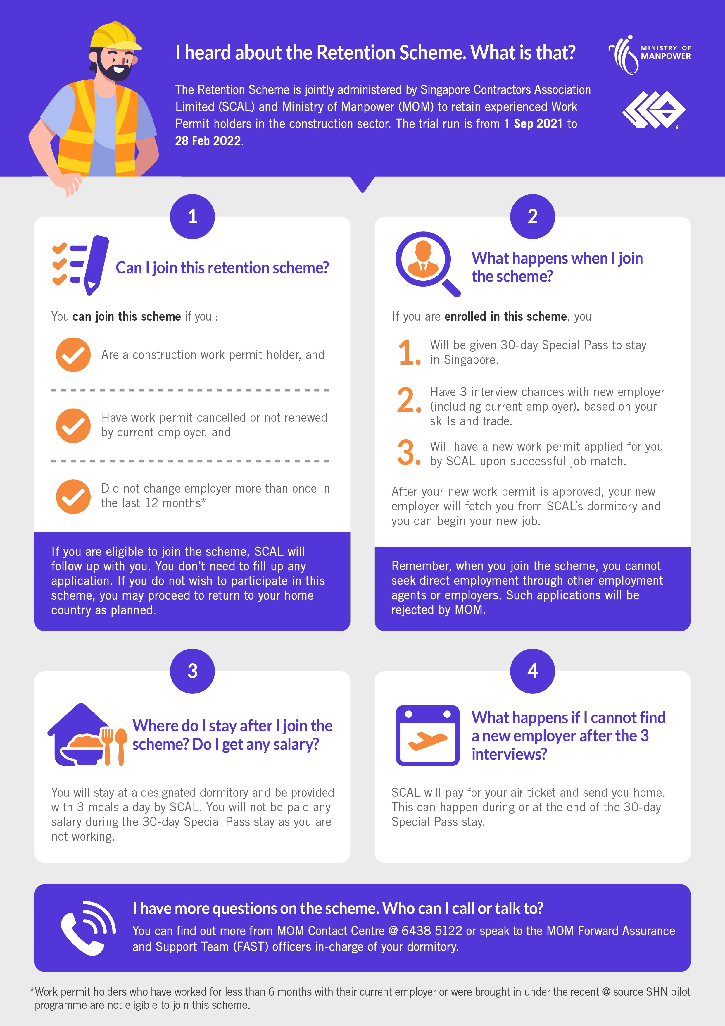 The Government will partner the Singapore Contractors Association Ltd (SCAL) to introduce a six-month retention scheme (1 September 2021 till 28 February 2022) for experienced construction WPHs whose previous employment has been terminated.