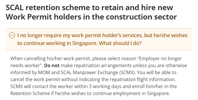 This was inconsistent with the rules of the retention scheme. Workers with expired work permits, but wanting to stay on in Singapore, were eligible for the scheme and TWC2 wrote back to MOM to point this out.
